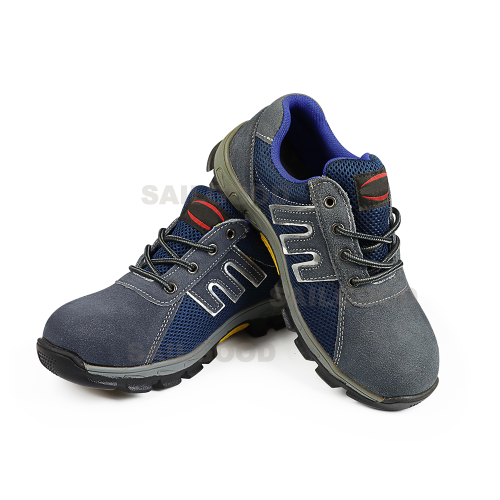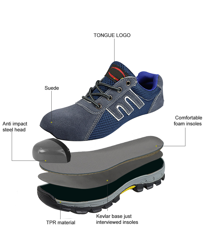 Durable blue safety shoes with suede & breathable mesh, TPR sole, steel toe and anti-puncture plate for full protection.