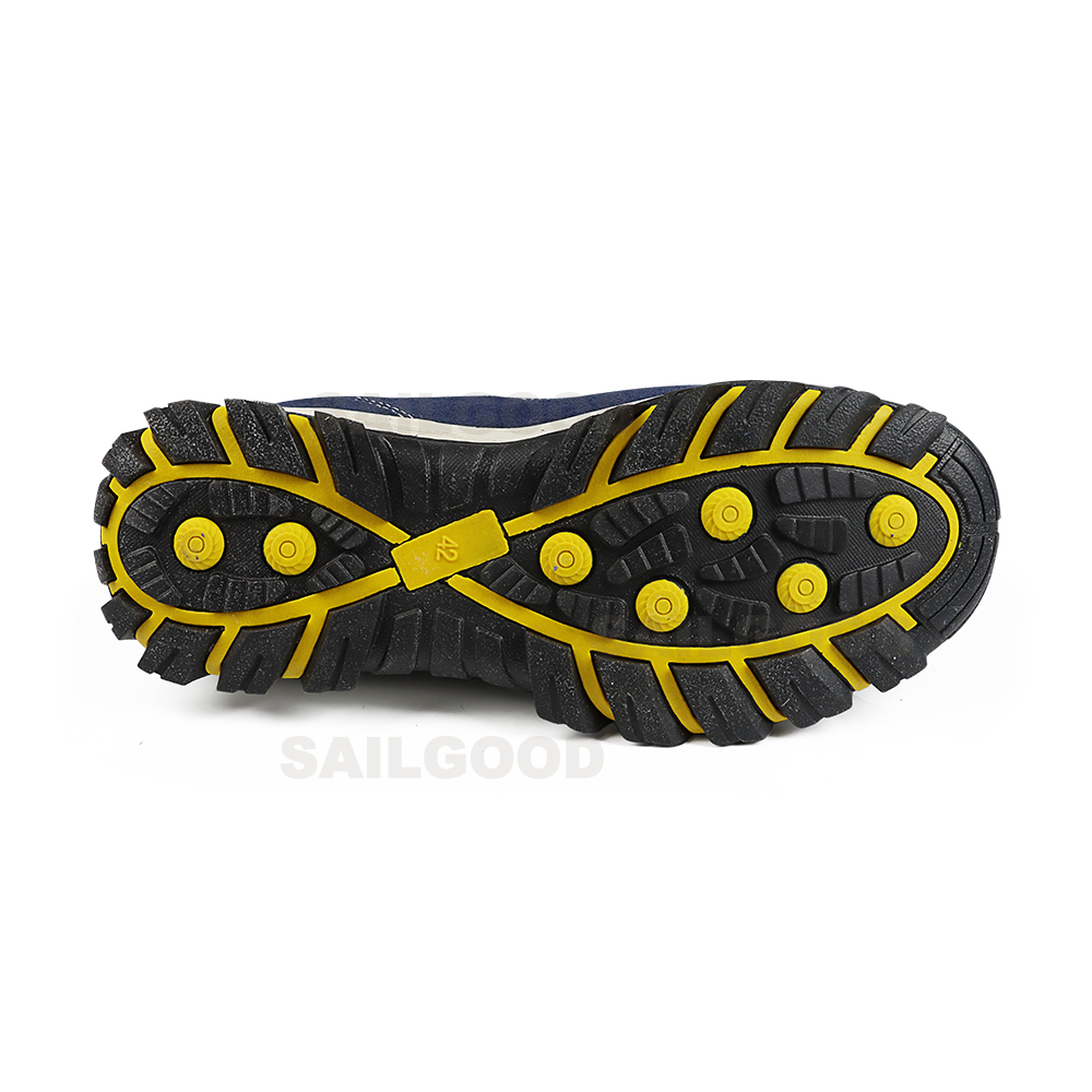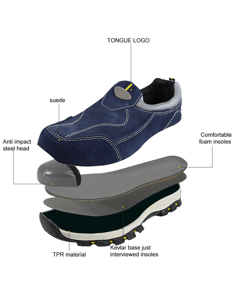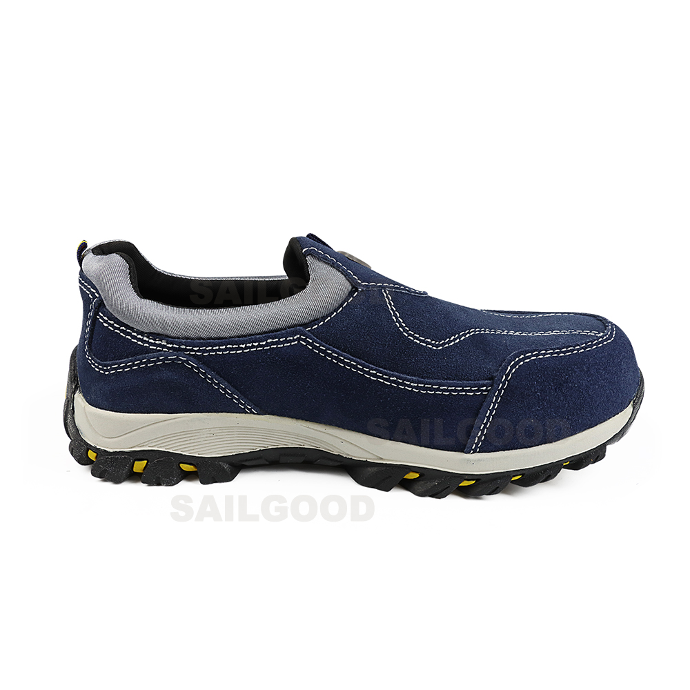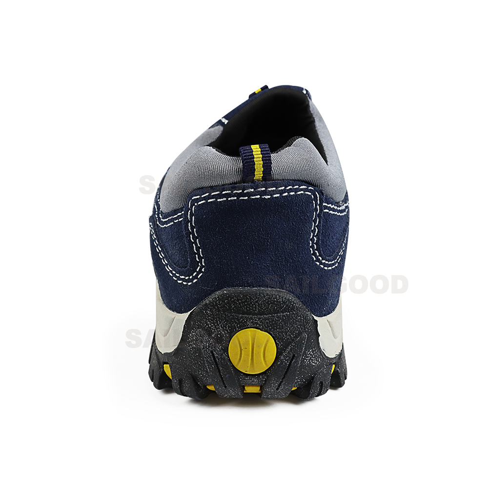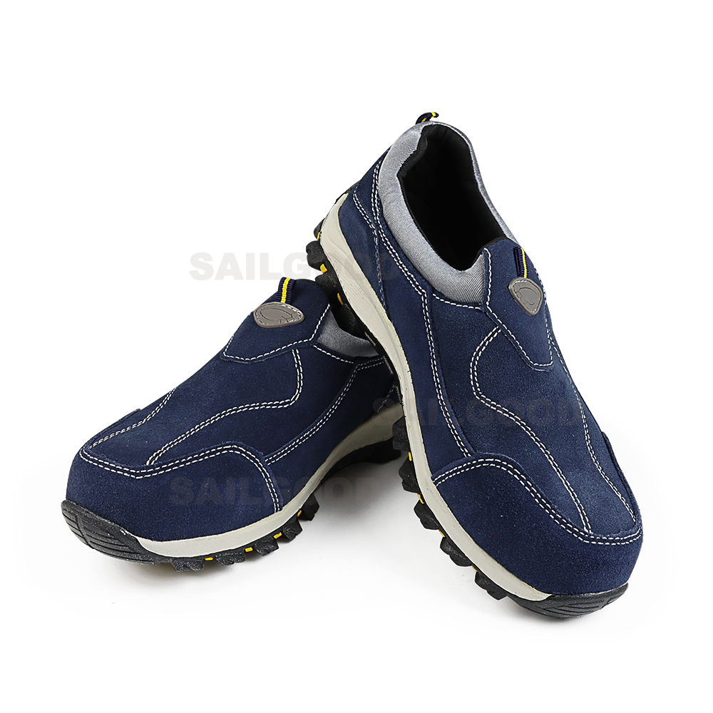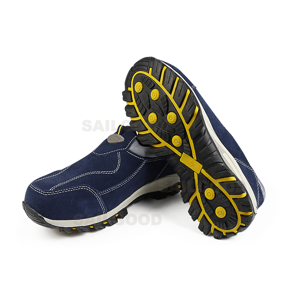 Model 618 dark blue safety shoes are made of high-quality suede, suitable for all seasons. Featuring a TPR sole for durability and slip resistance, certified steel toe cap, and anti-puncture steel plate, they provide reliable protection against impact and piercing hazards in industrial, construction, and warehouse environments. Available in sizes 36–45, these shoes offer comfort, safety, and long-lasting performance for workers.