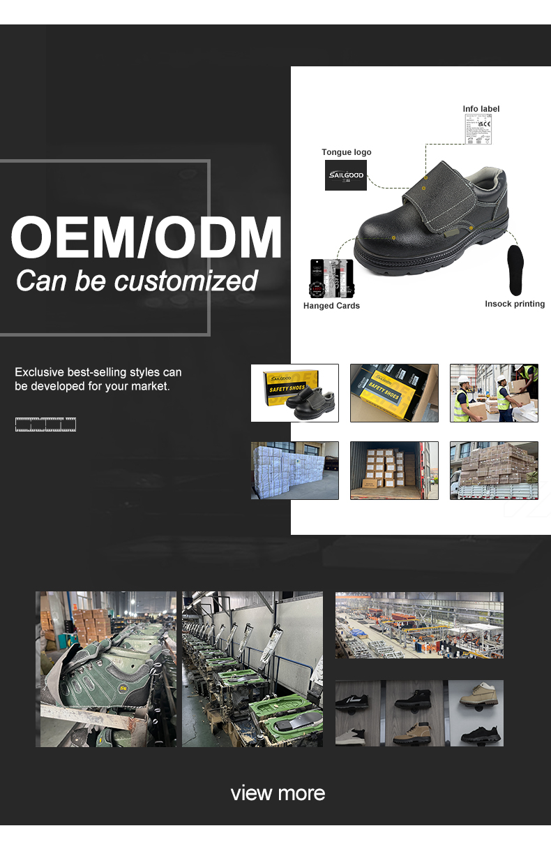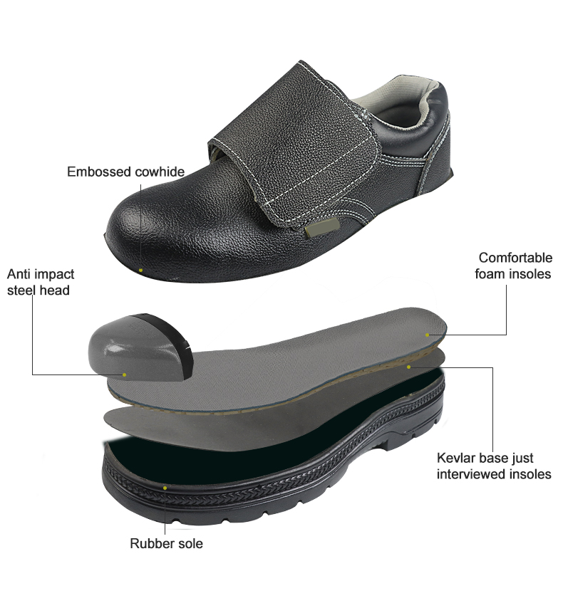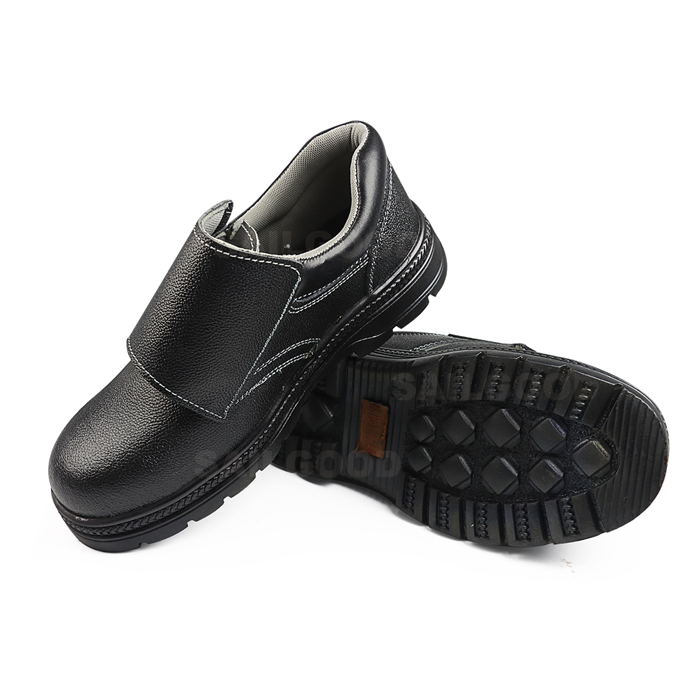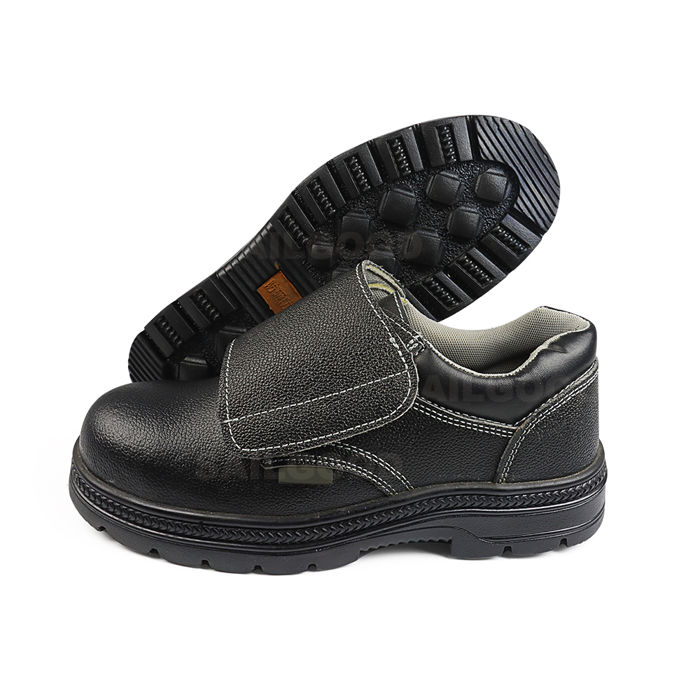 Model 813 black safety shoes feature an embossed cowhide surface for durability and style, combined with a rubber sole for slip resistance. Equipped with a certified steel toe cap and anti-puncture steel plate, these shoes provide reliable protection against impacts and piercing hazards in construction, industrial, and warehouse environments. Available in sizes 36–45, they ensure comfort, safety, and long-lasting performance for all-day work.